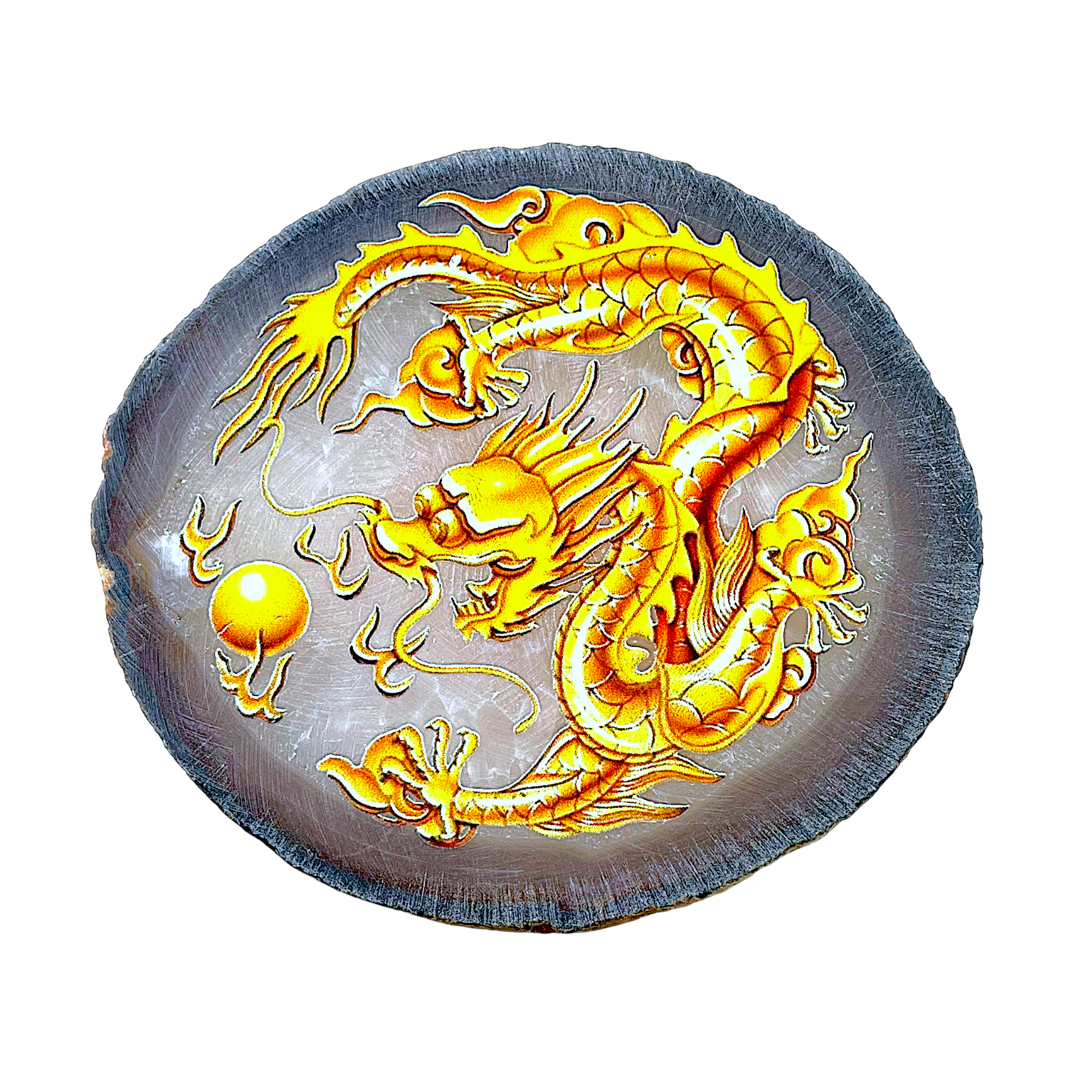 Plaque en Agate Botswana avec imprimé dragon jaune