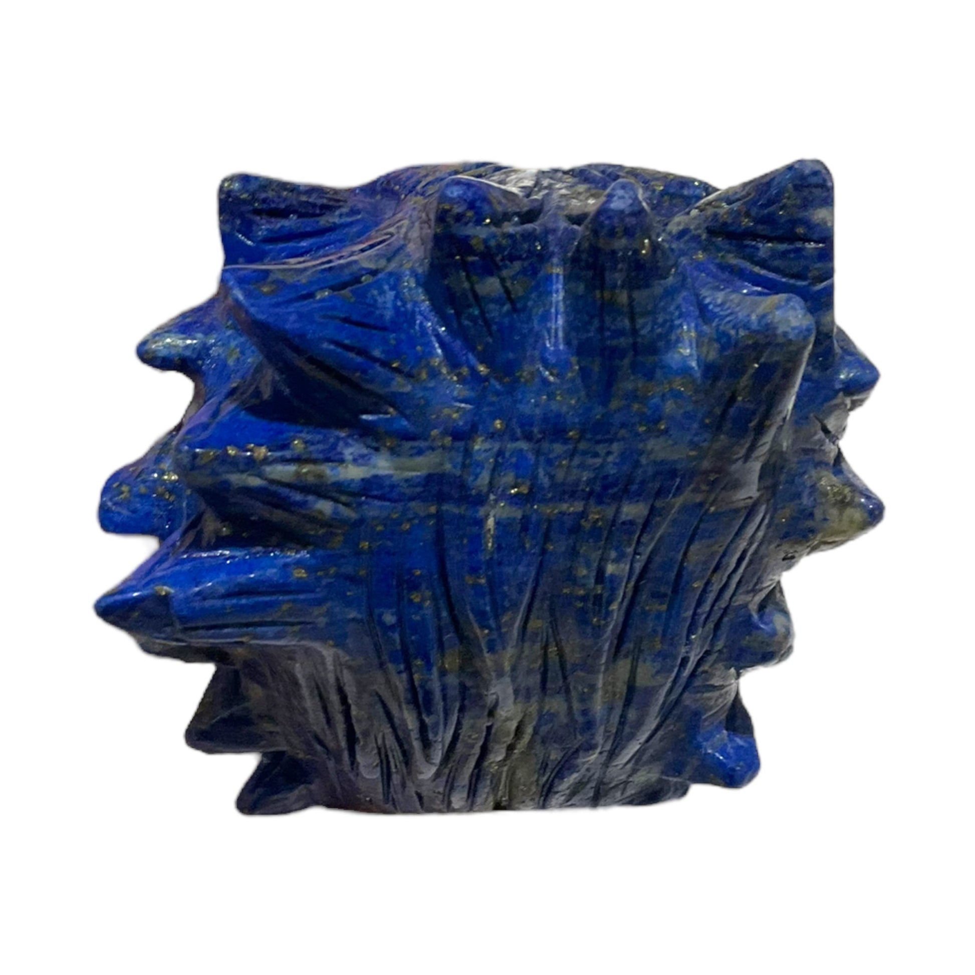 Le lapis-lazuli, pierre semi-précieuse et prisée, est ici mis à l'honneur dans toute sa splendeur, avec ses nuances de bleu profond et ses paillettes dorées qui scintillent sous la lumière. La tête de loup quant a elle est symbole de courage, de liberté, de force, capturant l'essence même de cet animal emblématique.